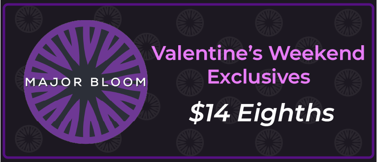 Valentine’s Day Exclusive: Select 3.5g flower are $14 this weekend only! Available while supplies last!