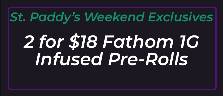 Mix & Match: 2 Fathom 1.0g infused pre-rolls for $18. Now through St. Paddy’s day, available while supplies last!